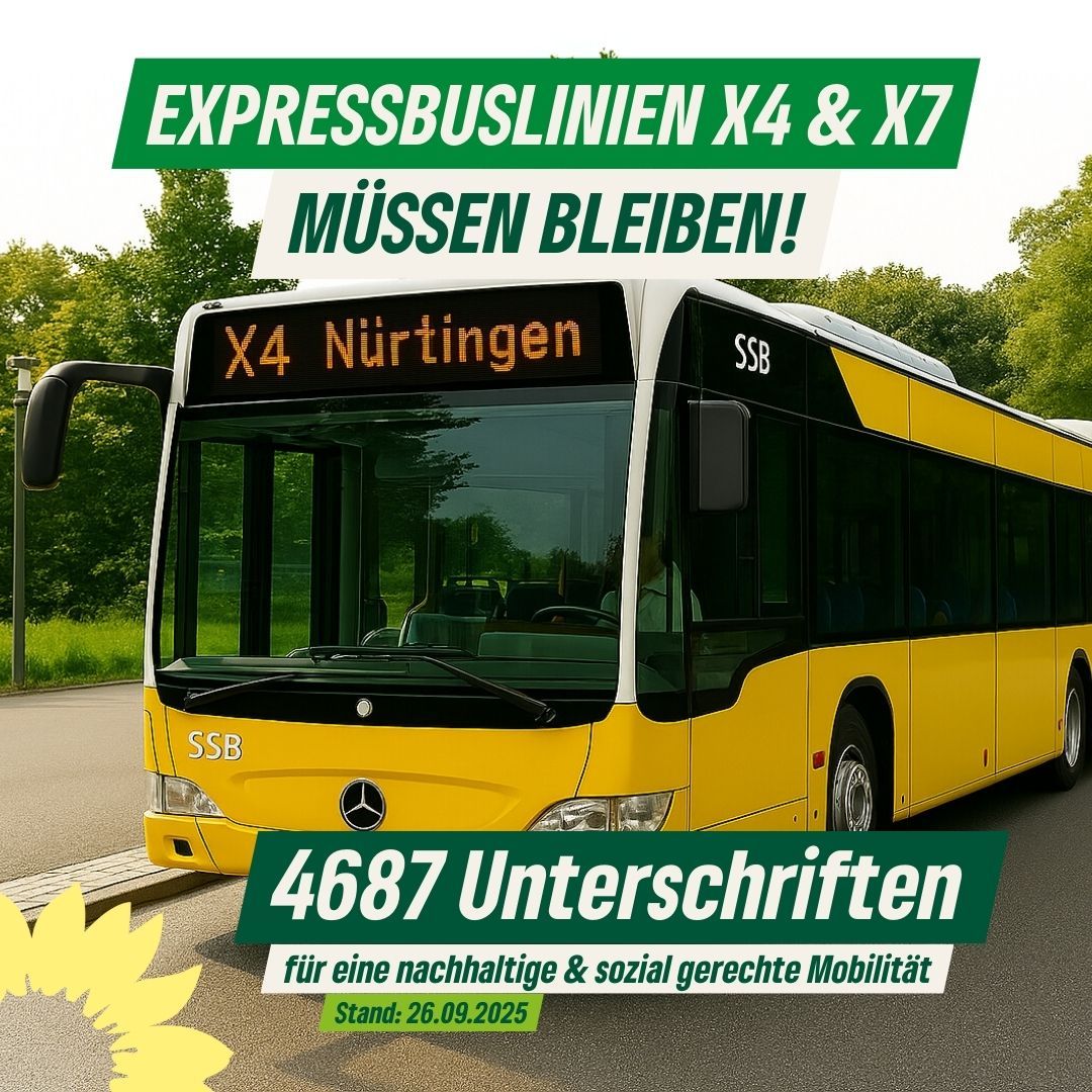 Am 29. September 2025 wurde die Petition „Expressbuslinien X4 & X7 müssen bleiben“ offiziell an das Landratsamt Esslingen übergeben. Dominic Dean Haag, Sprecher des Ortsverbands von Bündnis 90/Die Grünen Filderstadt, und Catherine Kalarrytou, Fraktionsvorsitzende der Grünen im Gemeinderat Filderstadt, überreichten die Unterschriften samt passendem Plakat Herrn Edgar Maihöfer, Amtsleiter des Amts für ÖPNV und Mobilität. Eine öffentliche und öffentlichkeitswirksame Übergabe direkt an Herrn Landrat Musolf war vonseiten des Landratsamts leider nicht möglich.
